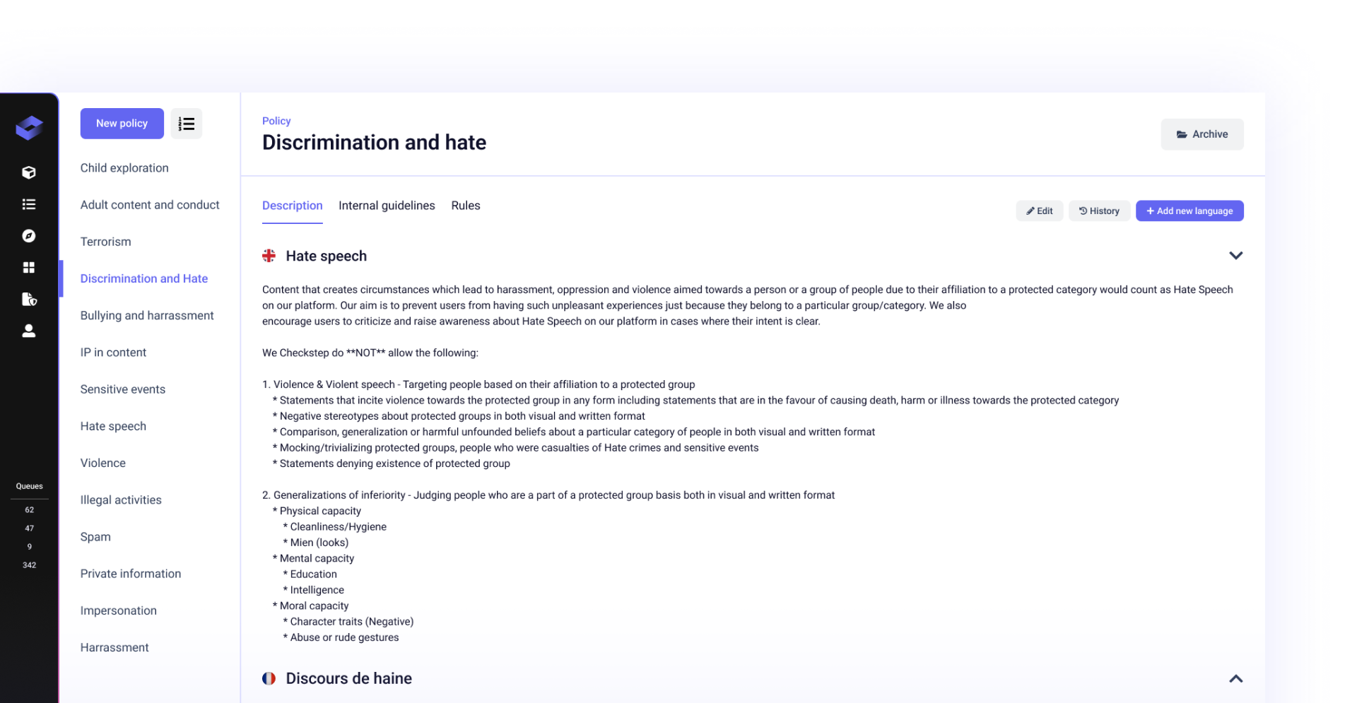 Covering all major abuse types, our policy engine lets you configure what is - and isn’t - allowed on your platform. Set your bespoke policy requirements - defining what is and what isn't allowed on your platform; Checkstep's policy workflow and automation platform does the rest.
