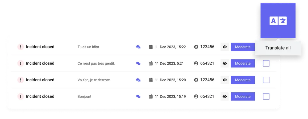 In November, Checkstep improved bulk translation features so that customers could translate foreign language content more easily, particularly when reviewing and digging for insights in content decisions. While Checkstep has long supported easy translation within the UI, teams can now translate whole chat conversations at once.